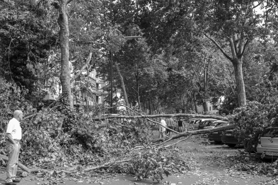 Mit Böen über 140 km/h fegte Ela über viele Städte hinweg. Besonders schwer traf es dabei auch Düsseldorf: Umgestürzte und ineinander verwobene Bäume, zersplitterte Kronen und ineinander verkeilte Äste bestimmten fortan das traurige Bild in Straßen, Parks und Grünanlagen. Der gesamte Verkehr in der Stadt erlag für Tage. In der Landeshauptstadt wurden tausende Bäume entwurzelt oder durch Starkastbruch geschädigt, ganze Parkanlagen zerstört. Hauptsächlich traf es die ältesten und stärksten "Riesen" mit ausladenden Kronen.